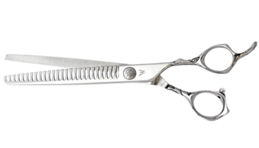 Washi's new 26 tooth texture shear is made from Japanese 440C steel for durability. This tool will remove weight from any coat. Made with grooved teeth for a clean cutting action.